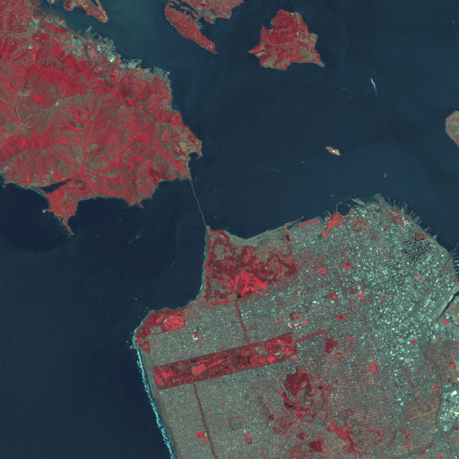 Following is a portion of a raw Landsat-7 scene over San Francisco, California, using bands 4, 3, and 2.