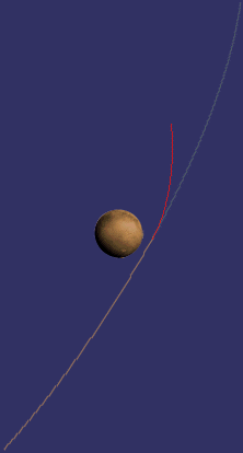 Mars Odyssey Orbit Insertion BurnAs it arrived at Mars, the spacecraft was travelling in an orbit that would have taken it past the red planet and right round the Sun. However, a precision 21 minute burn of the spacecraft's main rocket engine slowed it just enough for it to be captured by Mars' gravity. |