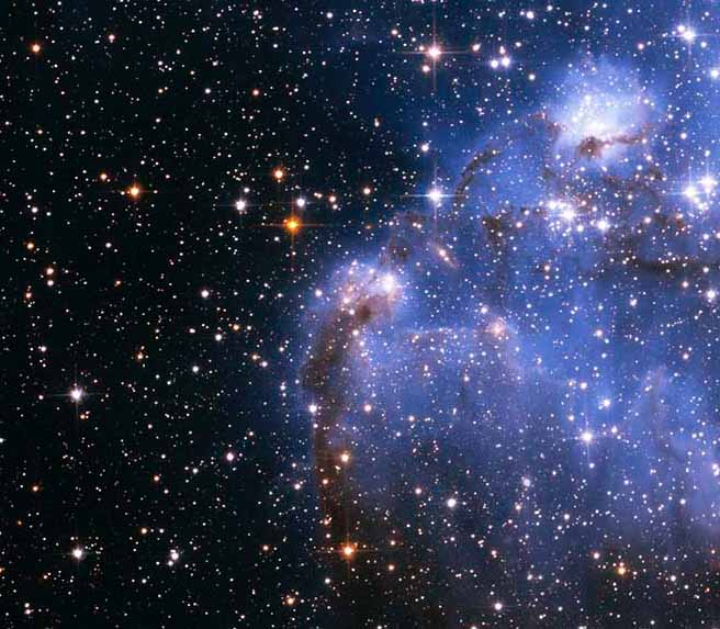 Dull red stars, only five million years old and half the mass of the Sun have formed in the dark region of cloud at the centre of the image. They have not condensed fully. They have yet to begin burning brightly.