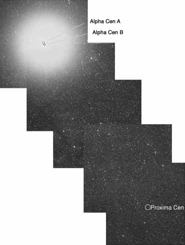 The Alpha Centauri Star System[1] - [2] - [3]A Three Star SystemProxima Centauri is the nearest known star to the Sun - 4.2 light years. The Alpha Centauri pair of orbiting stars is slightly further away at 4.3 light years. All three stars are moving through the galaxy together.