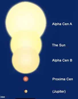 Proxima Centauri is one of the smallest and dimmest types of stars. Together the Alpha AB pair emit several million times more light than Proxima Centauri. Click here for details of star spectral classes. The star sizes in the figure are based on data from the ESO Very Large Telescope Array which directly measured the size of the Alpha Centauri System stars in March 2003. This difficult feat had never before been achieved. The size of the Sun and Jupiter are shown for comparison. |