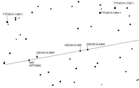 ChartOn this chart, Proxima Centauri, HIP70890, is shown at its 1897 position. Some of the other stars have been labeled with their catalog ids. The photo on page 3 shows many stars that are not listed in the Hipparcos, Tycho or GSC catalogs. Astronomical catalogs contain detailed information about the position, motion, spectral class and magnitude of stars. An sample catalog listing: The 150 stars closest to the Sun from the Hipparcos Catalog |