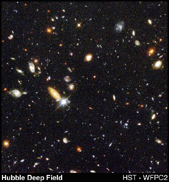 Deepest Image YetOn January 15th, astronomers meeting in San Antonio, Texas, unveiled the deepest image ever taken by the Hubble Space Telescope. It's actually 342 separate exposures taken over 10 consecutive days in late December 1995 and added together.Location, Size and ContentsLocated near the handle of the Big Dipper, the chosen field has a high galactic latitude and looks relatively empty through even the largest ground-based telescopes. It encompasses an area of the sky no larger than a grain of sand held at arms length. But in that 2.7 x 2.7 arcminute portion of sky, the HST uncovered more than 1,500 galaxies in both familiar and peculiar forms down to about 30th magnitude.A View back through TimeThe image is so deep that astronomers believe they are seeing galaxies during the early days of the universe, perhaps as little as a billion years after the Big Bang. They also hope it will bring answers to fundamental cosmological questions such as when galaxies first appeared and the ultimate fate of the universe. |