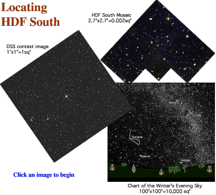 These pages provide a set of charts and photographs for locating the Hubble Deep Field South. All images are oriented as seen from southern Australia in July. Note: from southern Australia, Tucana never sets - HDF south's position is locatable throughout the year. The vastness of the sky becomes apparent to any who attempt to precisely locate the position of faint objects in the night sky. If these pages stimulate you to locate Tucana and try to locate HDF South, they will have served their purpose. Michael Gallagher | |