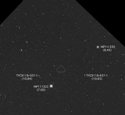 The brightest star in the DSS image is the one at its centre, 7th magnitude HIP111322. Although the image contains thousands of stars, not one can be seen with the unaided eye. Astronomers don't find this surprising. Only 6,000 stars are visible to the unaided eye, whereas the sky covers more than 40,000 square degrees. Many interesting objects are visible in the DSS Context Field, including galaxies, a planetary nebula and perhaps even an eye lash that got stuck to the plate during scanning. (Note: the spikes and circles around the brighter stars are artifacts caused by diffraction and reflection of light inside the telescope and camera). |
